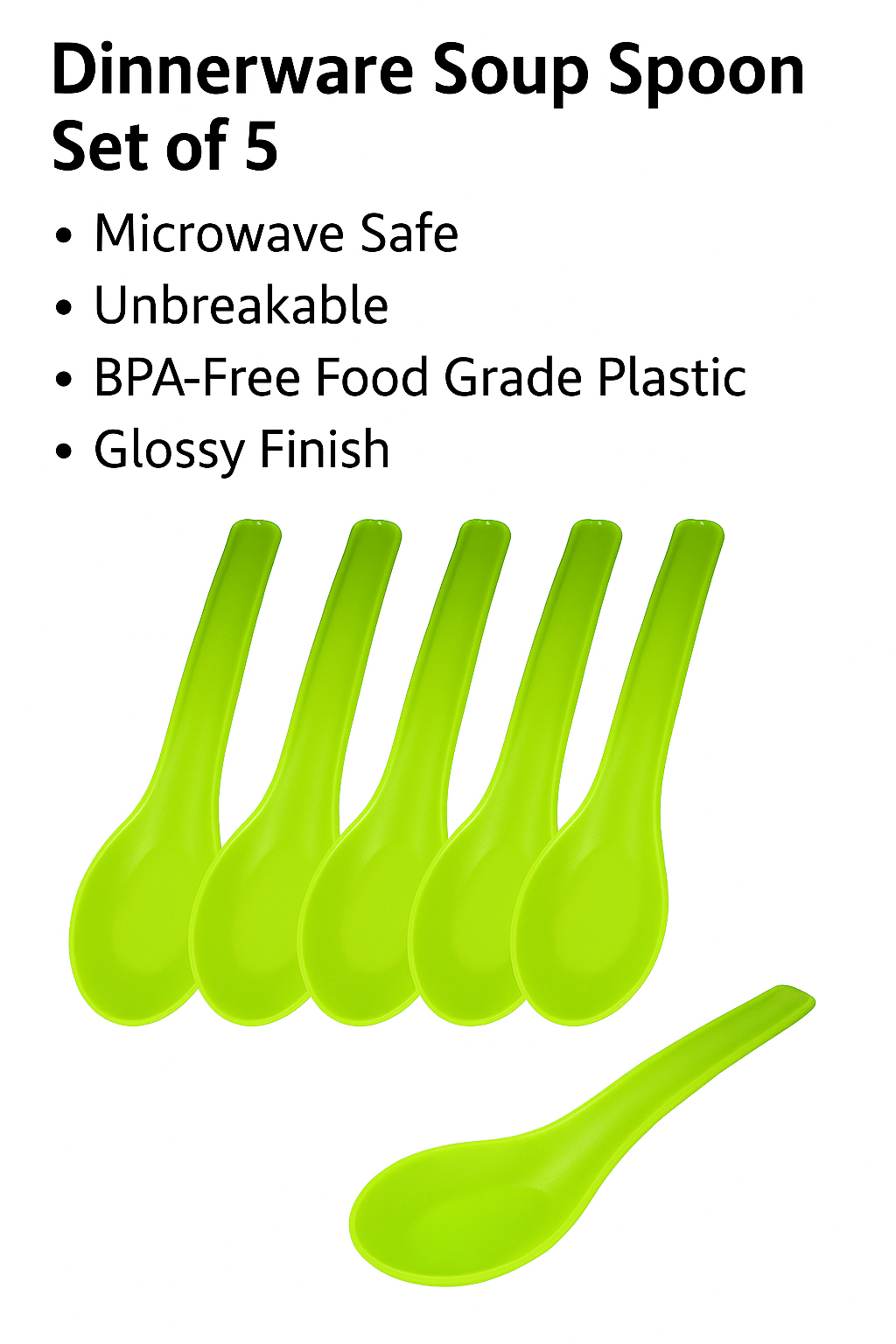 Dinnerware Soup Spoon Set of 5 – Microwave Safe, Unbreakable, BPA-Free Food Grade Plastic, Glossy Finish (Lime Green)