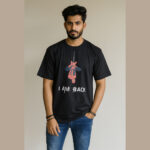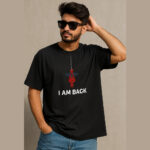 This black cotton t-shirt features a bold and stylish graphic of a red Spider-Man-inspired figure hanging upside down from a web. Below the graphic, the phrase “I AM BACK” is printed in eye-catching white uppercase letters, making a strong and confident statement. The design blends a pop-culture reference with minimalistic typography, making it a trendy and casual fashion choice.