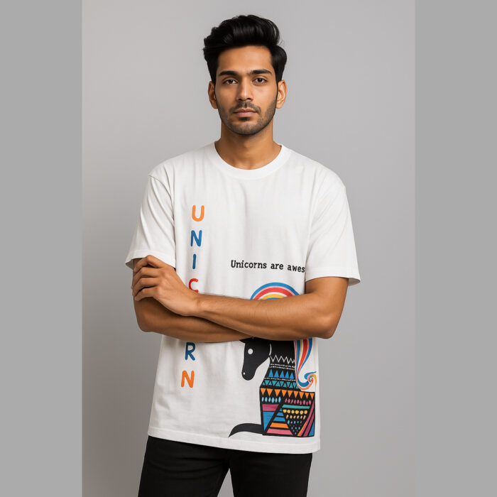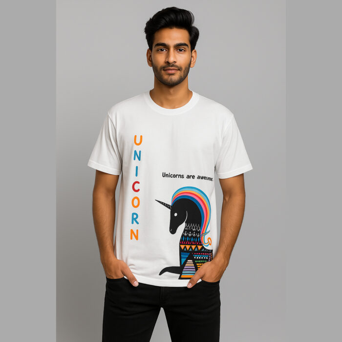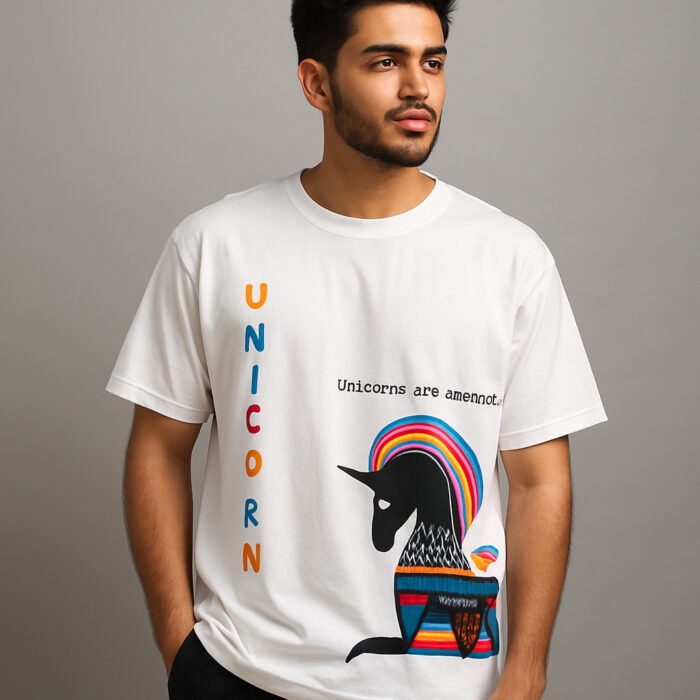 Text on the left side written vertically: “UNICORN” in bright orange, blue, and red letters.