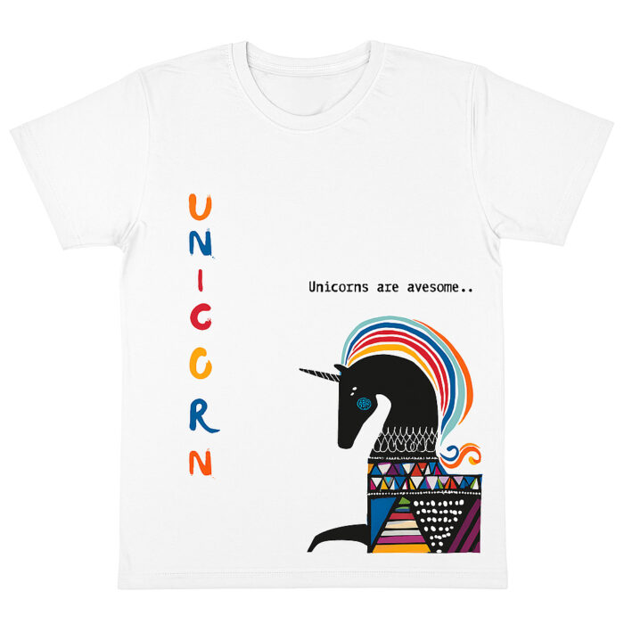 The unicorn graphic is in black with a vibrant multicolor mane (orange, blue, pink, and cyan) and tribal-style decorative patterns on the body.